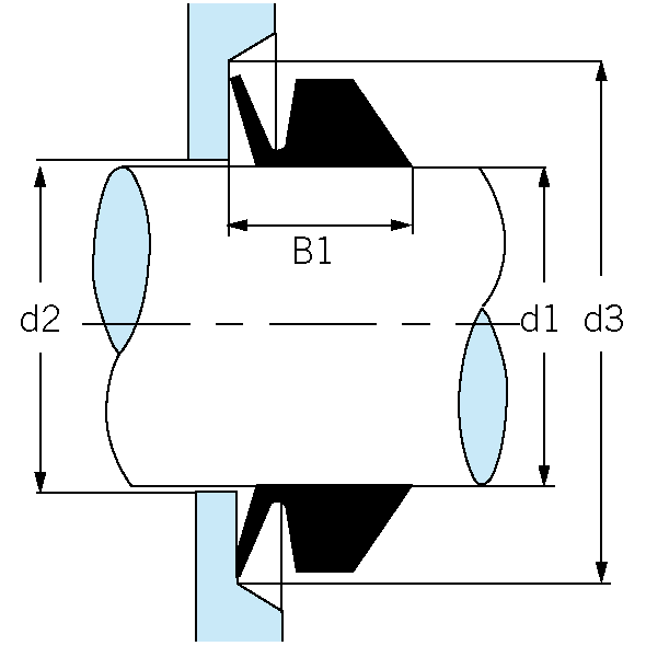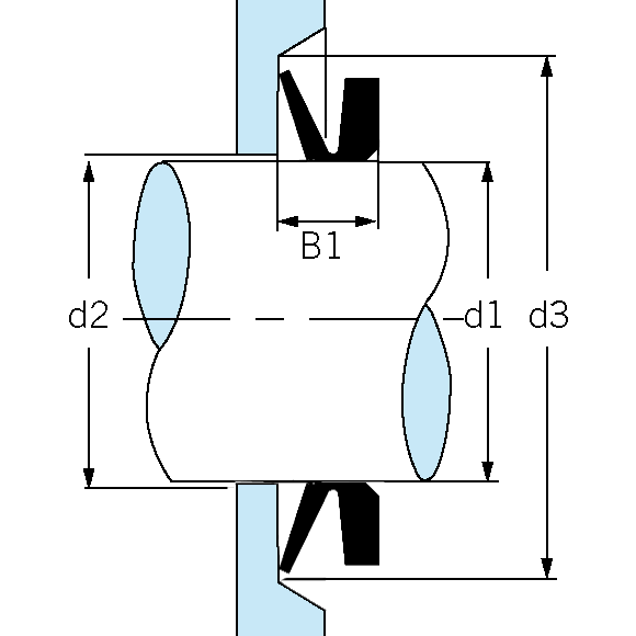| Обозначение | Диаметр вала d1 мм | Внутренний диаметр кольца d мм | Высота профиля C мм | Ширина рабочей кромки A мм | Ширина профиля B мм | d2 max. | d3 min. | Ширина посадочного места B1 |