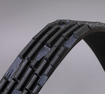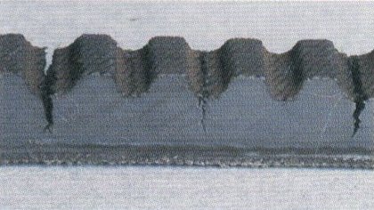 Причина: постоянное воздействие высоких температур и напряжение изгиба вокруг шкивов. Трещины возникают в верхней части ребра и растут в сторону корда.