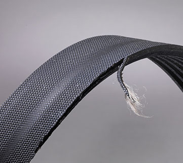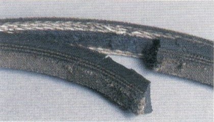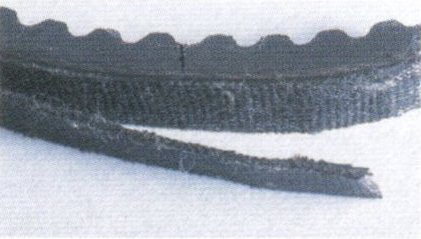 Причина: попадание постороннего предмета между ремнем и шкивом, которое привело к разрыву нитей несущего корда; даже если полный разрыв не просматривается, он может произойти при натяжении. К другим причинам можно отнести заклинивание одного из шкивов или сильные ударные нагрузки в процессе работы.